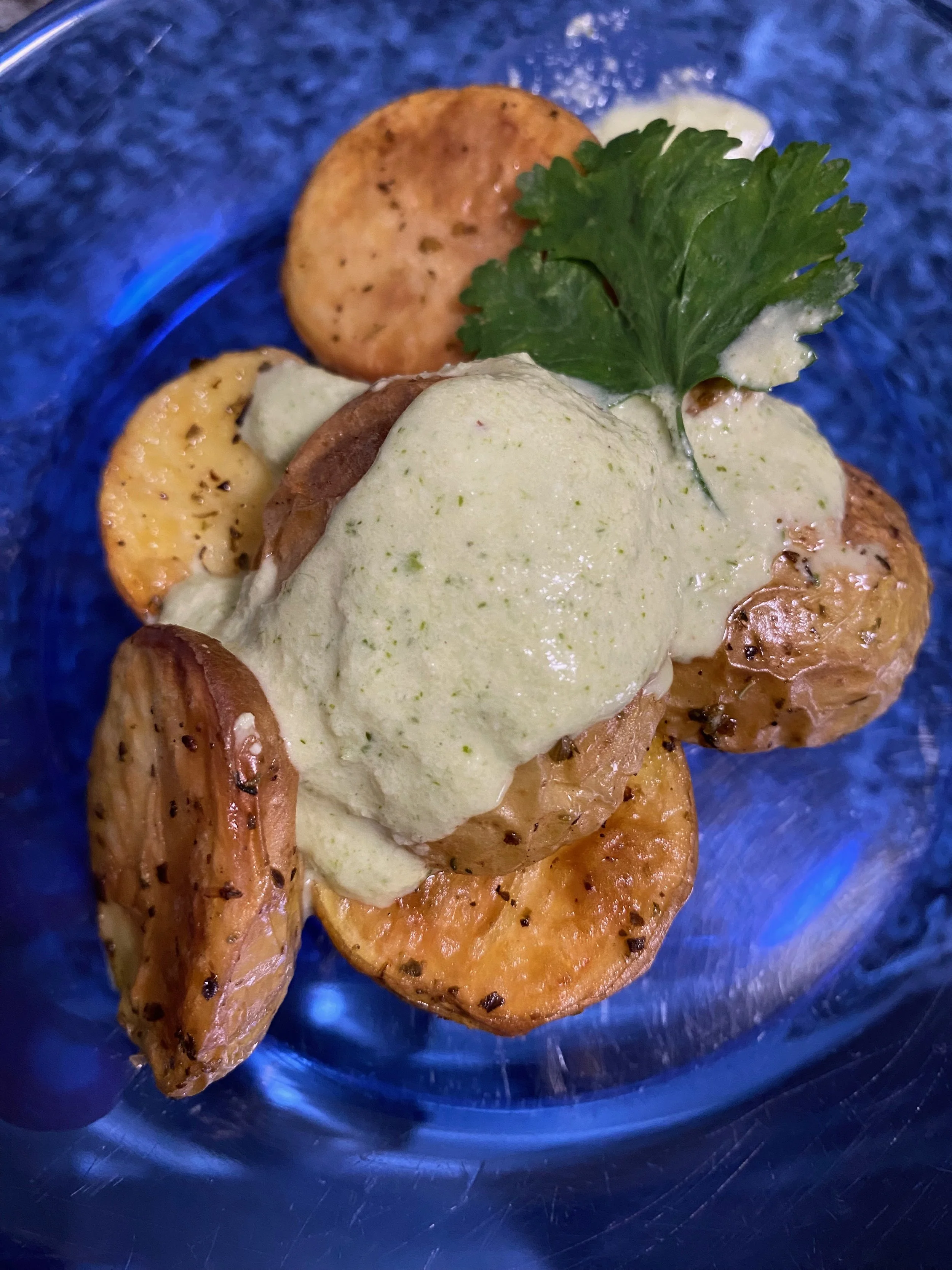 Cubrimos con crema de cilantro (receta aparte), palta en rodajas y cilantro fresco.